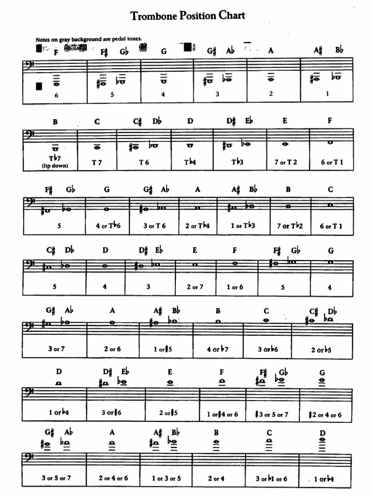 Trombone Note Chart - For the sake of correct notes, please photocopy and distribute freely. They can be used in class. Our trombone slide chart is a comprehensive guide that helps you master your instrument's slide positions. The free chart can be downloaded and printed for your reference. Use this ultimate trombone slide chart to learn all the notes and their positions. The trombone has 7 slide positions, and you can play several of notes on each slide position. This is the yamaha corporation [musical instrument guide] website. Enharmonic notes *sound* the same but have a different letter name. Pitch is controlled by blowing a note on the correct partial combined with moving the slide to the correct position. Here we’ll go through the slide positions and give a chart for the notes these positions can (roughly) produce. Follow this trombone position chart to learn how to play the notes on the instrument. This chart shows how to play each note on a trombone using it’s slide position. For trombones, why does sheet music notation differ from the fundamental tone of the instrument? This is the yamaha corporation [musical instrument guide] website. For the sake of correct notes, please photocopy and distribute freely. Tenor trombonists can ignore the positions using the second valve (marked δ or γ), as well as. They can be used in class. Our trombone slide chart is a comprehensive guide that helps you master your instrument's slide positions. The free chart can be downloaded and printed for your reference. As we’ll discuss later, the precise positioning doesn’t actually matter for. The trombone has 7 slide positions, and you can play several of notes on each slide position. The overtone series chart provides comprehensive information about available alternate positions. Our trombone slide chart is a comprehensive guide that helps you master your instrument's slide positions. For trombones, why does sheet music notation differ from the fundamental tone of the instrument? This. This chart shows how to play each note on a trombone using it’s slide position. They can be used in class. As we’ll discuss later, the precise positioning doesn’t actually matter for. For trombones, why does sheet music notation differ from the fundamental tone of the instrument? For the sake of correct notes, please photocopy and distribute freely. Our trombone slide chart is a comprehensive guide that helps you master your instrument's slide positions. Use this ultimate trombone slide chart to learn all the notes and their positions. As we’ll discuss later, the precise positioning doesn’t actually matter for. Pitch is controlled by blowing a note on the correct partial combined with moving the slide to the correct. Tenor trombonists can ignore the positions using the second valve (marked δ or γ), as well as. Here we’ll go through the slide positions and give a chart for the notes these positions can (roughly) produce. These flashcards will help beginning (and more advanced) trombonists to learn, memorize, and master every note, note name, and slide position on the trombone.. Perfect for beginners and experienced musicians alike, our chart. Follow this trombone position chart to learn how to play the notes on the instrument. This is the yamaha corporation [musical instrument guide] website. For the sake of correct notes, please photocopy and distribute freely. This chart shows how to play each note on a trombone using it’s slide position. The overtone series chart provides comprehensive information about available alternate positions. This is the yamaha corporation [musical instrument guide] website. For the sake of correct notes, please photocopy and distribute freely. Use this ultimate trombone slide chart to learn all the notes and their positions. Perfect for beginners and experienced musicians alike, our chart. The trombone has 7 slide positions, and you can play several of notes on each slide position. For trombones, why does sheet music notation differ from the fundamental tone of the instrument? This is the yamaha corporation [musical instrument guide] website. Follow this trombone position chart to learn how to play the notes on the instrument. Enharmonic notes *sound* the. For the sake of correct notes, please photocopy and distribute freely. This chart shows how to play each note on a trombone using it’s slide position. The trombone has 7 slide positions, and you can play several of notes on each slide position. Enharmonic notes *sound* the same but have a different letter name. Tenor trombonists can ignore the positions. The trombone has 7 slide positions, and you can play several of notes on each slide position. This is the yamaha corporation [musical instrument guide] website. They can be used in class. Use this ultimate trombone slide chart to learn all the notes and their positions. The overtone series chart provides comprehensive information about available alternate positions. Pitch is controlled by blowing a note on the correct partial combined with moving the slide to the correct position. The free chart can be downloaded and printed for your reference. The overtone series chart provides comprehensive information about available alternate positions. Perfect for beginners and experienced musicians alike, our chart. Here we’ll go through the slide positions and give. These flashcards will help beginning (and more advanced) trombonists to learn, memorize, and master every note, note name, and slide position on the trombone. The overtone series chart provides comprehensive information about available alternate positions. For more about the function of an f attachment trigger see:. The free chart can be downloaded and printed for your reference. They can be used in class. Tenor trombonists can ignore the positions using the second valve (marked δ or γ), as well as. Here we’ll go through the slide positions and give a chart for the notes these positions can (roughly) prod